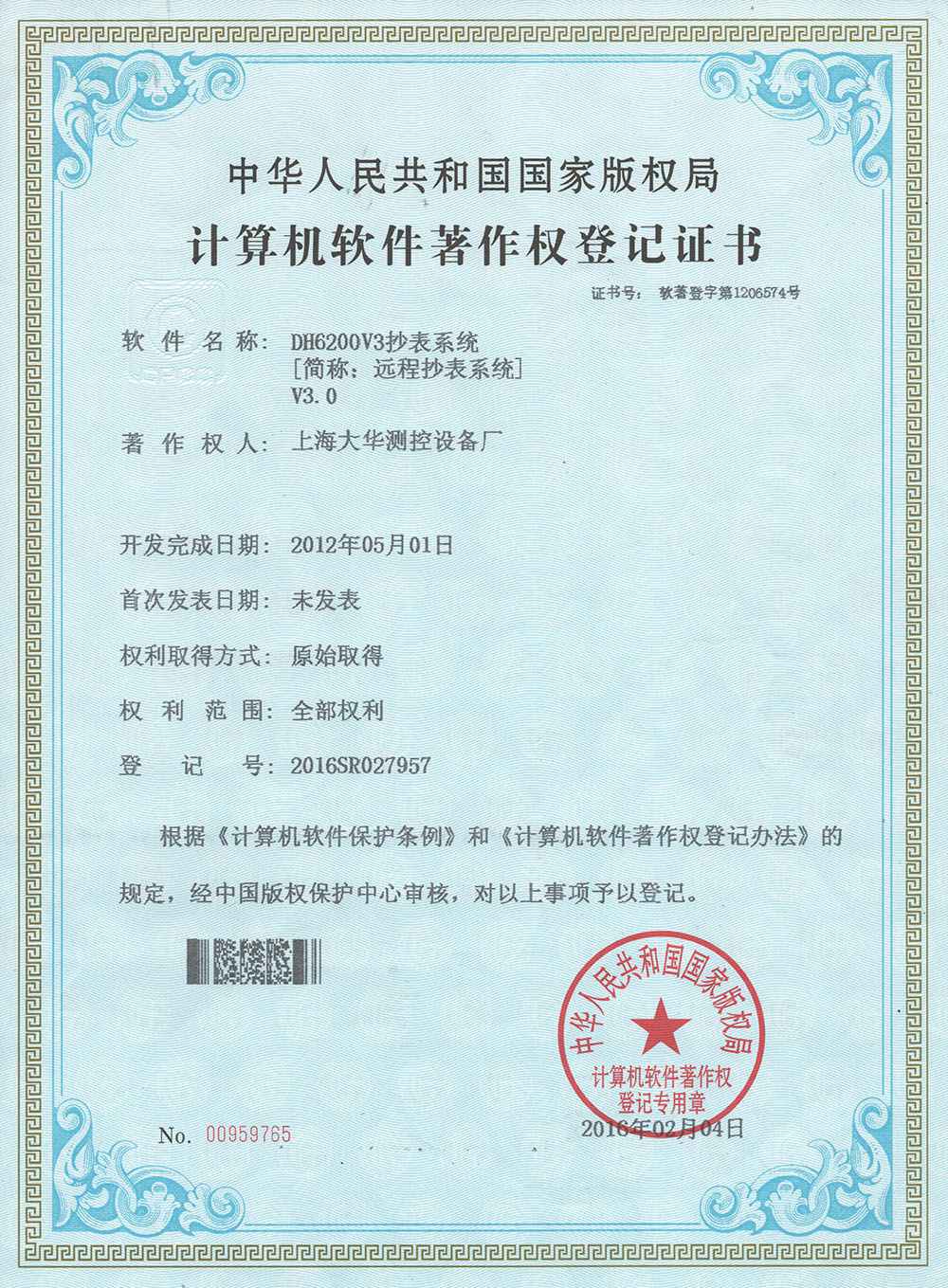 2016年2月 计算机软件著作登记证-DH6200V3抄表系统;