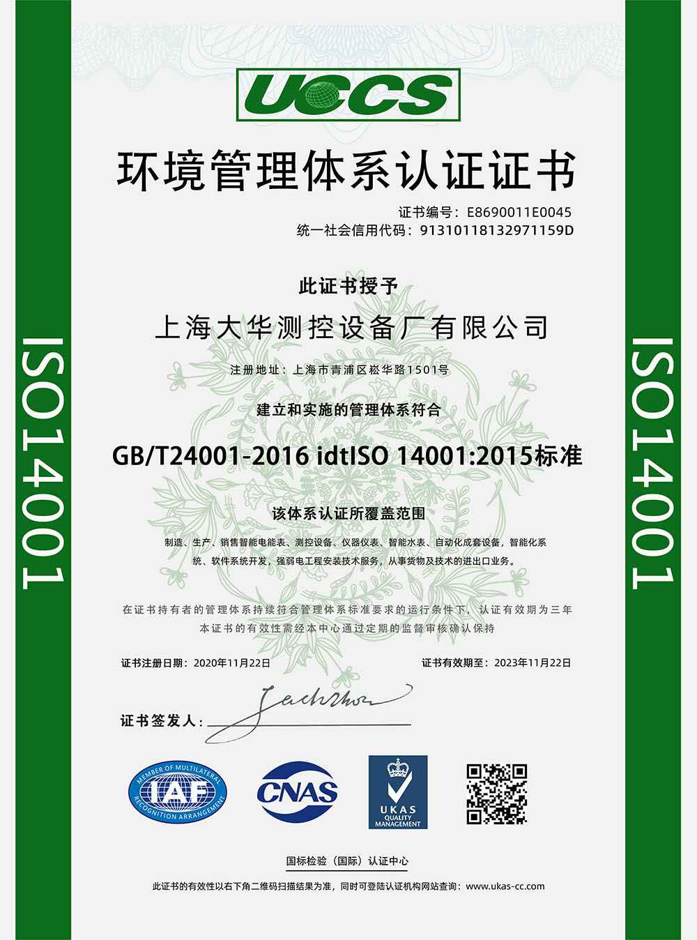 2020年 UCCS环境管理体系认证证书;